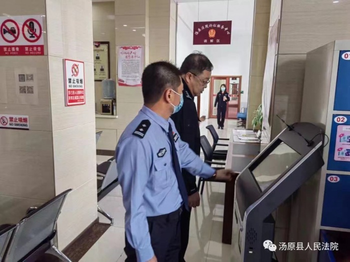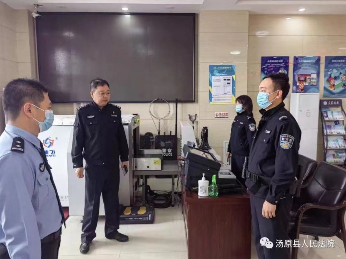 法警队长黄涛及教导员孙彬首先对各岗安检设施、警用设备等进行了查看,确保岗位警用设备使用保障。随后,对各岗人员安全检查操作、来访人员登记、测温扫码情况进行检查,并对发现的问题督促立行立改。