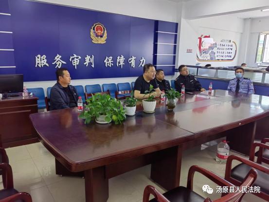 为不断提升法院安全环境,8月31日,佳木斯市中级人民法院法警支队政委毛海升、三级高级警长蒋本鸿、督查室主任张巍一行三人至汤原县人民法院及派出法庭进行警务安全检查工作,党组成员、副院长韩锋,法警队大队长黄涛,教导员孙彬陪同。
