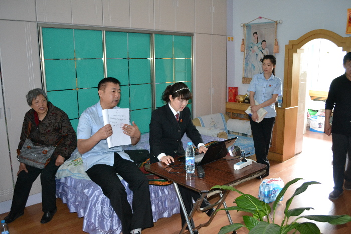 汤原县人民法院民一庭切实贯彻执行党的群众路线,关心群众切身利益,方便服务当事人,到当事人家中开庭,既方便了当事人,又有广泛的法制宣传教育意义。