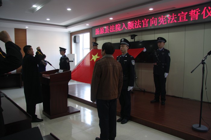 12月2日上午10时,汤原县人民法院25名员额法官向宪法宣誓仪式在法院三楼会议室举行。面对国旗,常务副院长滕东明同志带领全体入额法官进行宣誓,县人大副主任刘玉泉同志进行了监誓。