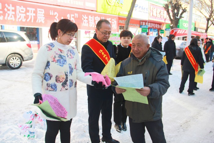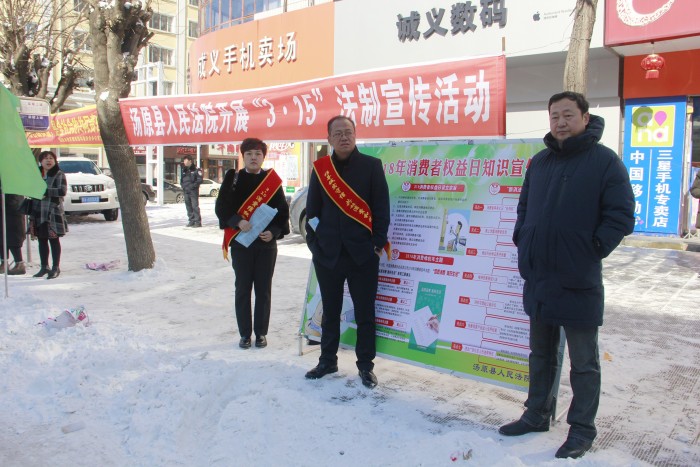 3月15日上午,按照汤原县消费者协会的统一部署,汤原法院派出宣传小分队,在汤原镇中华路繁华地段,与其他单位一起开展了以“品质消费 美好生活”为主题的法制宣传活动。党组成员、副院长韩锋,党组成员杨明晨与干警一起参加了宣传活动。
