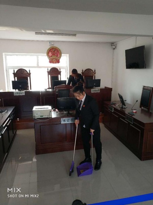 现在,小编带领大家走进汤原法院胜利法庭......8:10分,伴随着清凉的空气,小编早早的来到胜利法庭,看到书记员柳玉梅、李菲、法警郑朋程已经来到法庭。书记员在认真打扫审判区域的卫生,法警整理好着装,检查警用器械,站在自己的岗位等待着群众的到来。随后小编来到姜源泉庭长的办公室,他正在准备今日审理案件所需材料。
