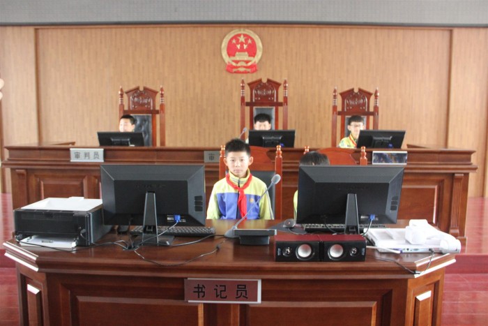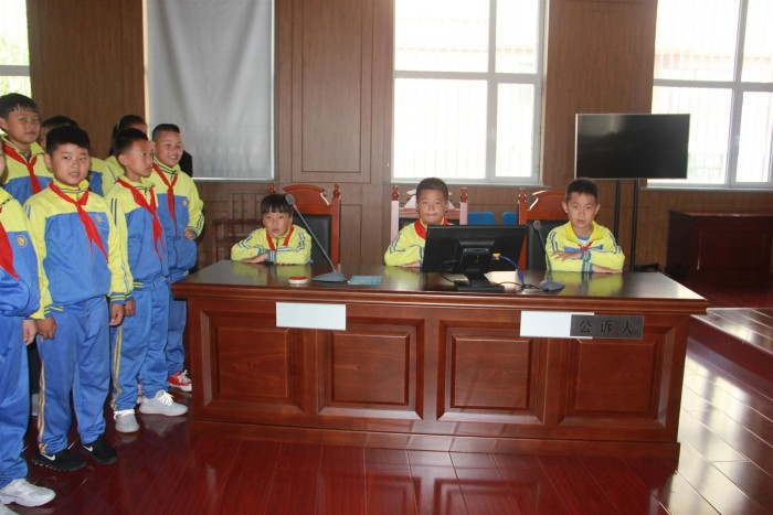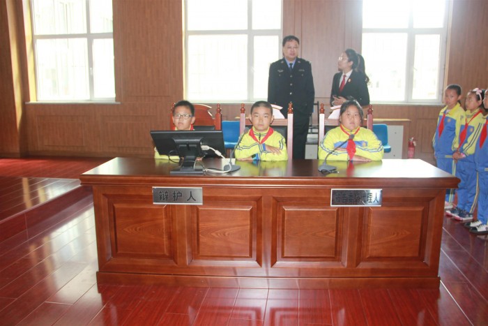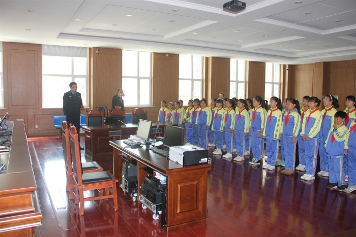 走进刑事审判庭,学生们热情高涨,仔细聆听法院干警讲解法庭的先进设置、开庭程序、原被告、犯罪嫌疑人的座位等,主动积极走上审判台,试坐法椅,试敲法槌,亲身体验法庭的庄严神圣。