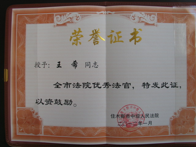 鹤立法庭庭长王希同志,工作表现突出,鹤立法庭连续多年调解率居于全市领先水平,被佳木斯市中级人民法院授予优秀法官荣誉称号。