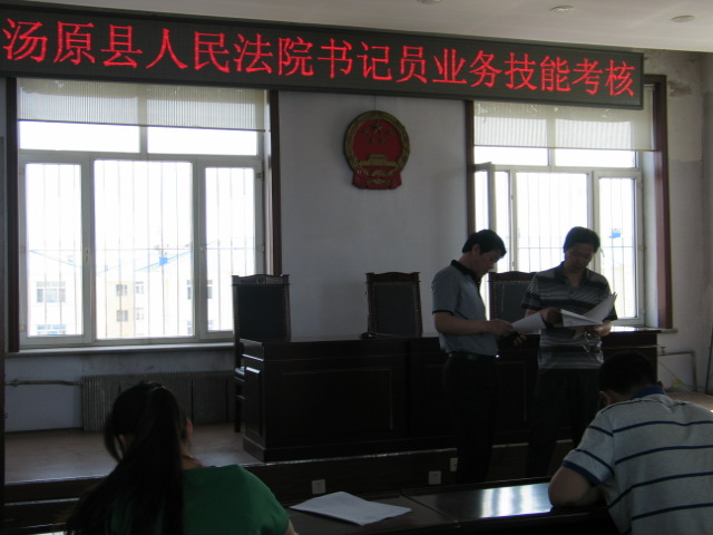 为加强法院书记员队伍建设,提高书记员业务技能,从而更好地为审判工作服务,汤原法院于5月31日组织了书记员业务技能考核竞赛。考核由研究室负责组织,分为电脑录入与写作两个方面内容,由郑成章院长担任主考官,其他党组成员担任副监考,对考核结果作出严格、公平、客观的评判,并将评判结果与工作岗位直接挂钩,对于不能胜任本职工作的在编书记员要待岗学习,聘用书记员予以辞退。