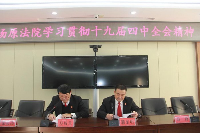 郑成章要求,全体党员干部要认真学习领会四中全会精神,深入学习《决定》内容,将全会精神融入到法院的审判执行工作中,坚持和完善中国特色社会主义法治体系,提高党依法治国、依法执政能力。建设中国特色社会主义法治体系、建设社会主义法治国家是坚持和发展中国特色社会主义的内在要求。必须坚定不移走中国特色社会主义法治道路,全面推进依法治国,坚持依法治国、依法执政、依法行政共同推进,坚持法治国家、法治政府、法治社会一体建设,加快形成完备的法律规范体系、高效的法治实施体系、严密的法治监督体系、有力的法治保障体系,加快形成完善的党内法规体系,全面推进科学立法、严格执法、公正司法、全民守法,推进法治中国建设。