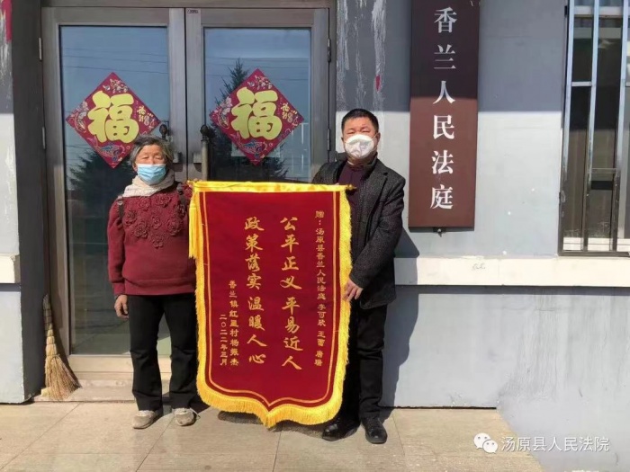 近日,汤原县香兰镇红星村村民杨某将一面写有“公平正义平易近人、政策落实温暖人心”的锦旗送到汤原法院香兰法庭,对该庭审理的一件供用水合同纠纷案件结果表示衷心感谢。