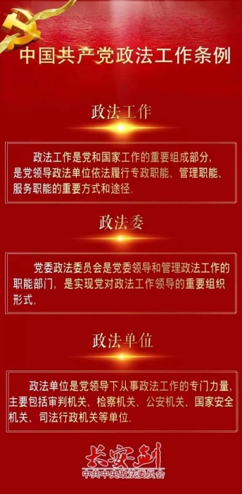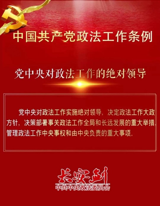 第一条 为了坚持和加强党对政法工作的绝对领导,做好新时代党的政法工作,根据《中国共产党章程》、《中华人民共和国宪法》和有关法律,制定本条例。