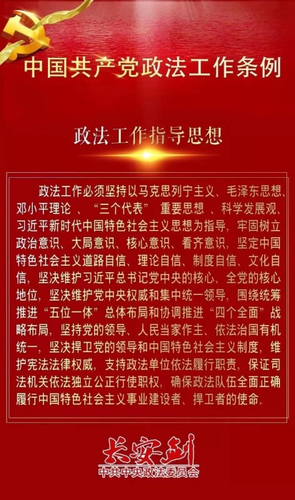 第四条 政法工作必须坚持以马克思列宁主义、毛泽东思想、邓小平理论、“三个代表”重要思想、科学发展观、习近平新时代中国特色社会主义思想为指导,牢固树立政治意识、大局意识、核心意识、看齐意识,坚定中国特色社会主义道路自信、理论自信、制度自信、文化自信,坚决维护习近平总书记党中央的核心、全党的核心地位,坚决维护党中央权威和集中统一领导,围绕统筹推进“五位一体”总体布局和协调推进“四个全面”战略布局,坚持党的领导、人民当家作主、依法治国有机统一,坚决捍卫党的领导和中国特色社会主义制度,维护宪法法律权威,支持政法单位依法履行职责,保证司法机关依法独立公正行使职权,确保政法队伍全面正确履行中国特色社会主义事业建设者、捍卫者的使命。