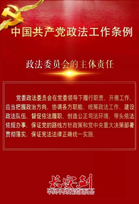 第十二条 党委政法委员会在党委领导下履行职责、开展工作,应当把握政治方向、协调各方职能、统筹政法工作、建设政法队伍、督促依法履职、创造公正司法环境,带头依法依规办事,保证党的路线方针政策和党中央重大决策部署贯彻落实,保证宪法法律正确统一实施。主要职责任务是: