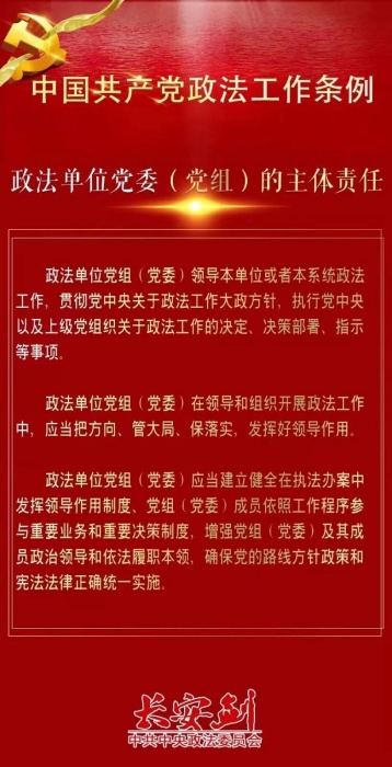 中共中央印发《中国共产党政法工作条例》(以下简称《条例》),以党内基本法规的形式,对党领导新时代政法工作进行全面制度擘画。《条例》共有9章39条,明确了党领导政法工作系列重大问题。