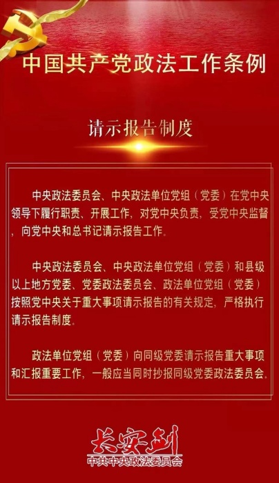 中央政法委员会、中央政法单位党组(党委)和县级以上地方党委、党委政法委员会、政法单位党组(党委)按照党中央关于重大事项请示报告的有关规定,严格执行请示报告制度。
