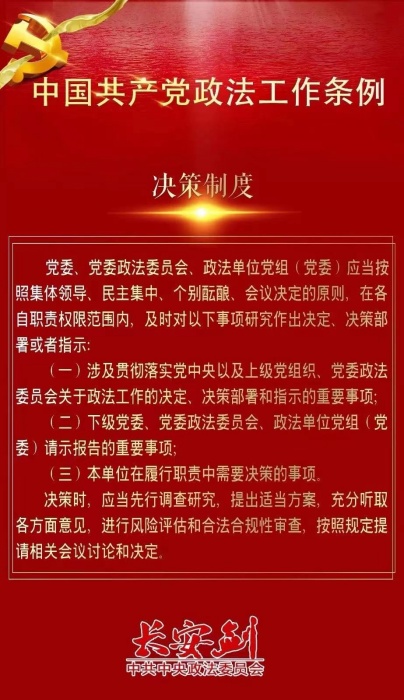 第二十三条 党委、党委政法委员会、政法单位党组(党委)应当按照集体领导、民主集中、个别酝酿、会议决定的原则,在各自职责权限范围内,及时对以下事项研究作出决定、决策部署或者指示: