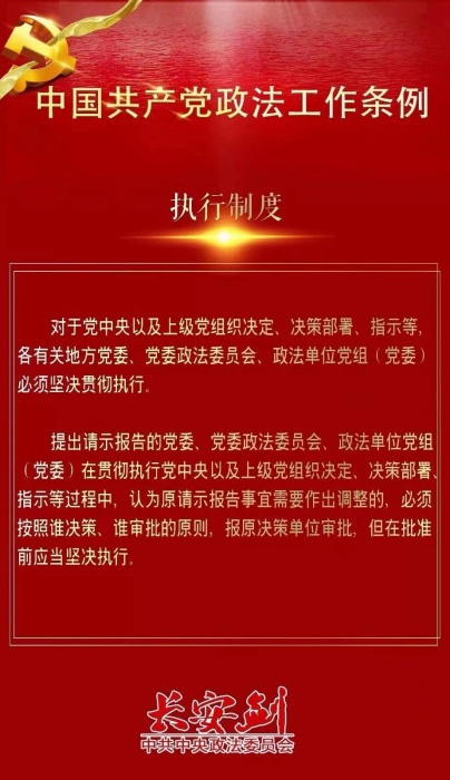 第二十四条 对于党中央以及上级党组织决定、决策部署、指示等,各有关地方党委、党委政法委员会、政法单位党组(党委)必须坚决贯彻执行。