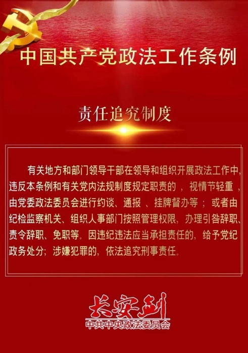 第三十五条 有关地方和部门领导干部在领导和组织开展政法工作中,违反本条例和有关党内法规制度规定职责的,视情节轻重,由党委政法委员会进行约谈、通报、挂牌督办等;或者由纪检监察机关、组织人事部门按照管理权限,办理引咎辞职、责令辞职、免职等。因违纪违法应当承担责任的,给予党纪政务处分;涉嫌犯罪的,依法追究刑事责任。