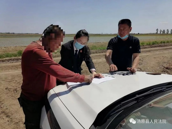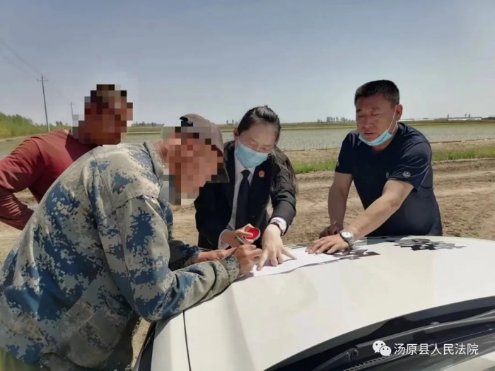 为了妥善化解矛盾,为当事人提供便利,案件的承办人决定下田地就地组织调解。随后调解团队驱车十几公里,前往张某某位于梧桐河农场的第十五大队的田间,在承办法官和干警的详细解释下,双方各让一步,最终达成调解,并当场在调解协议上签字,最终矛盾圆满解决,双方均表示满意。