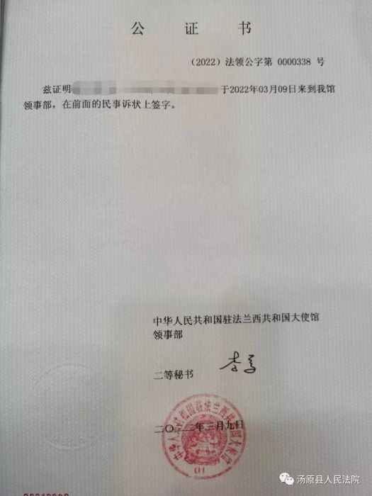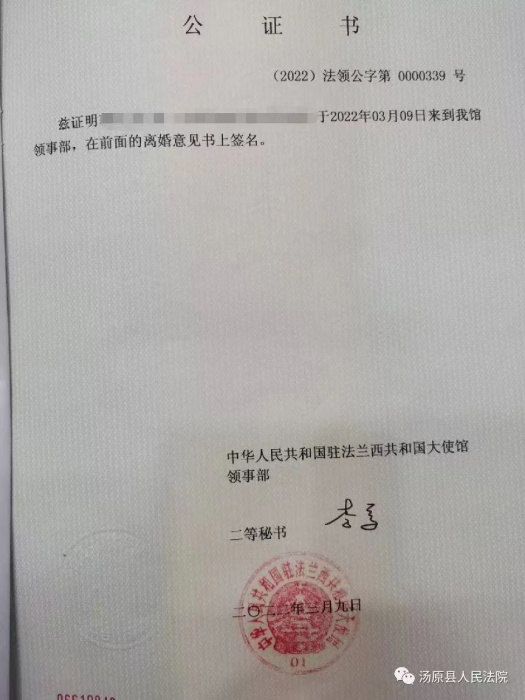 近期,汤原法院立案庭审判员胡延彬受理了一件特殊的离婚案件:原告在2019年7月就去了法国加上疫情的影响及个人因素至今未回过中国。原、被告经多次的咨询,多次准备,才向本院提交了基本的起诉材料,并附上了中国驻法国大使馆相应的公证书。